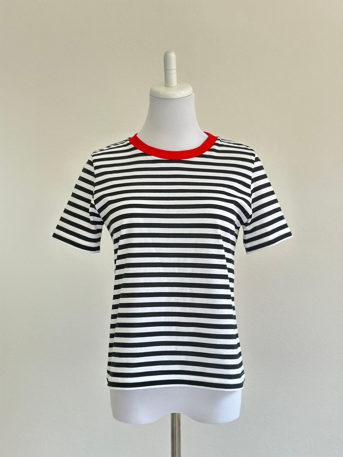 SALLUREらしい遊び心のある色使いを一般的なボーダーカットソーで使用されるボートネックではなくクルーネックにすることで、カジュアル過ぎずジャケットやカーディガンの下にもすっきりと合わせていただけます。