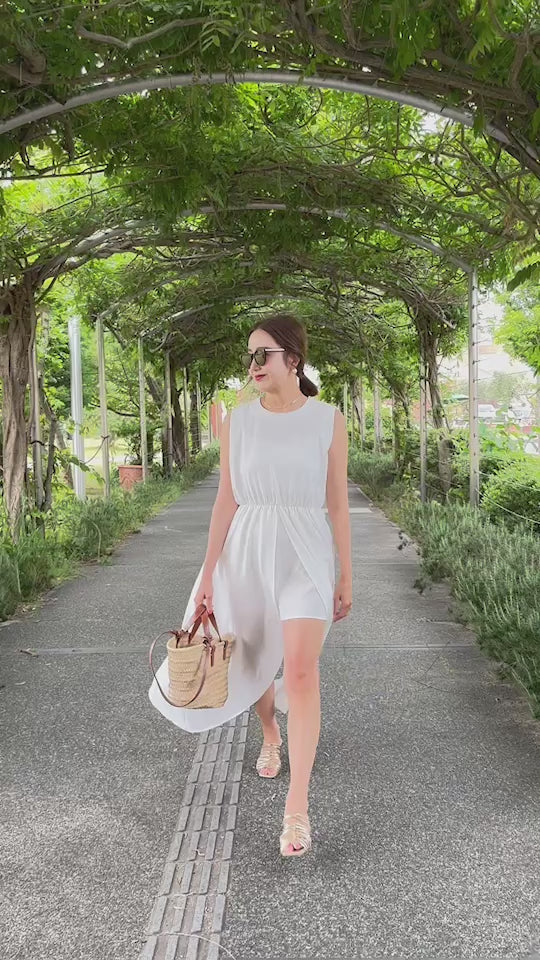 後から見るとシンプルなロングワンピースですが、前から見るとチラっと足が見え、中はショートパンツなので安心して着用していただける女性らしいワンピースです。