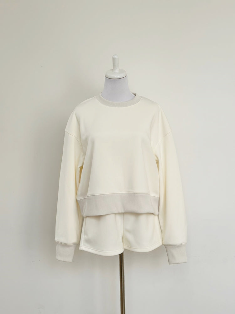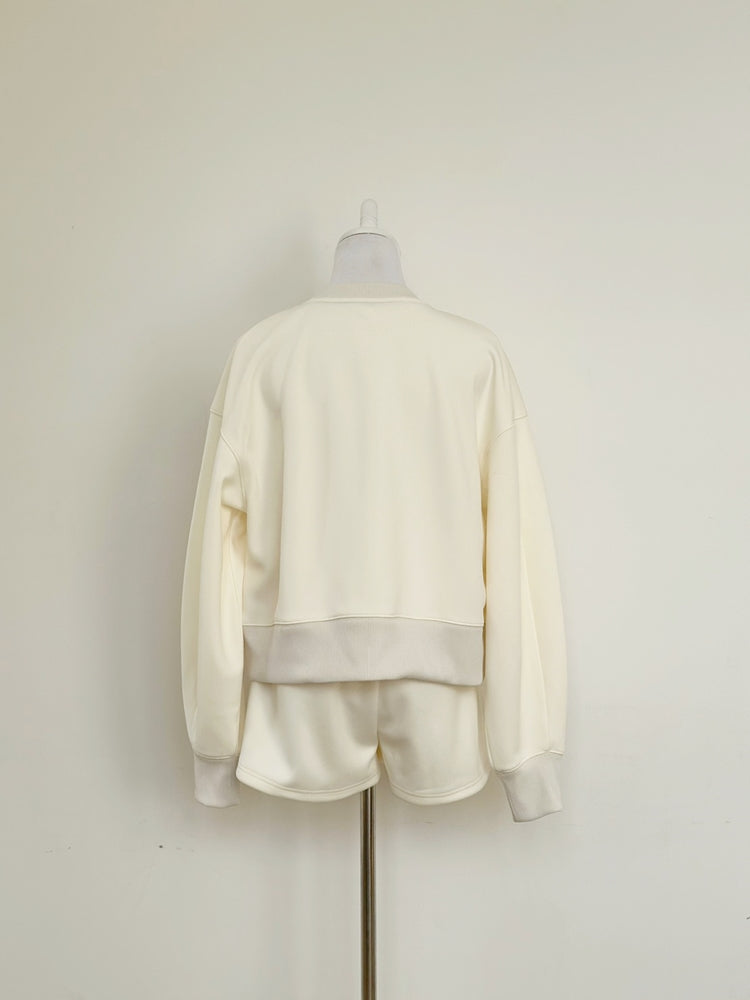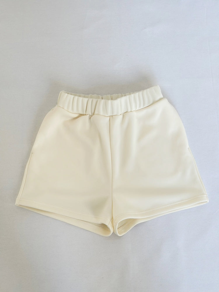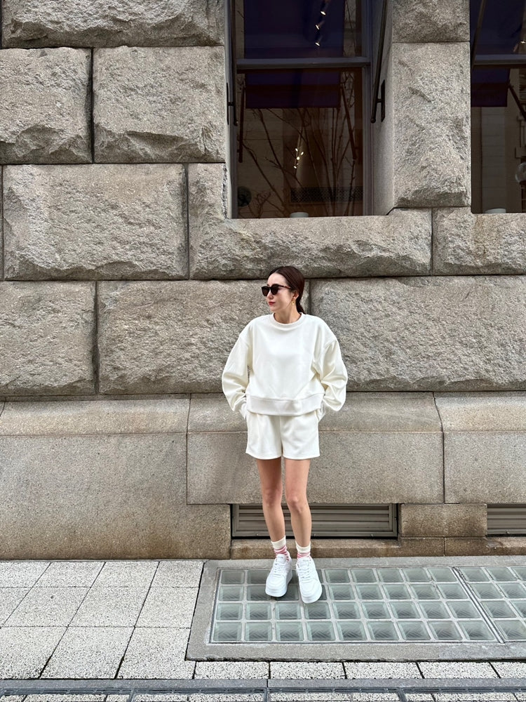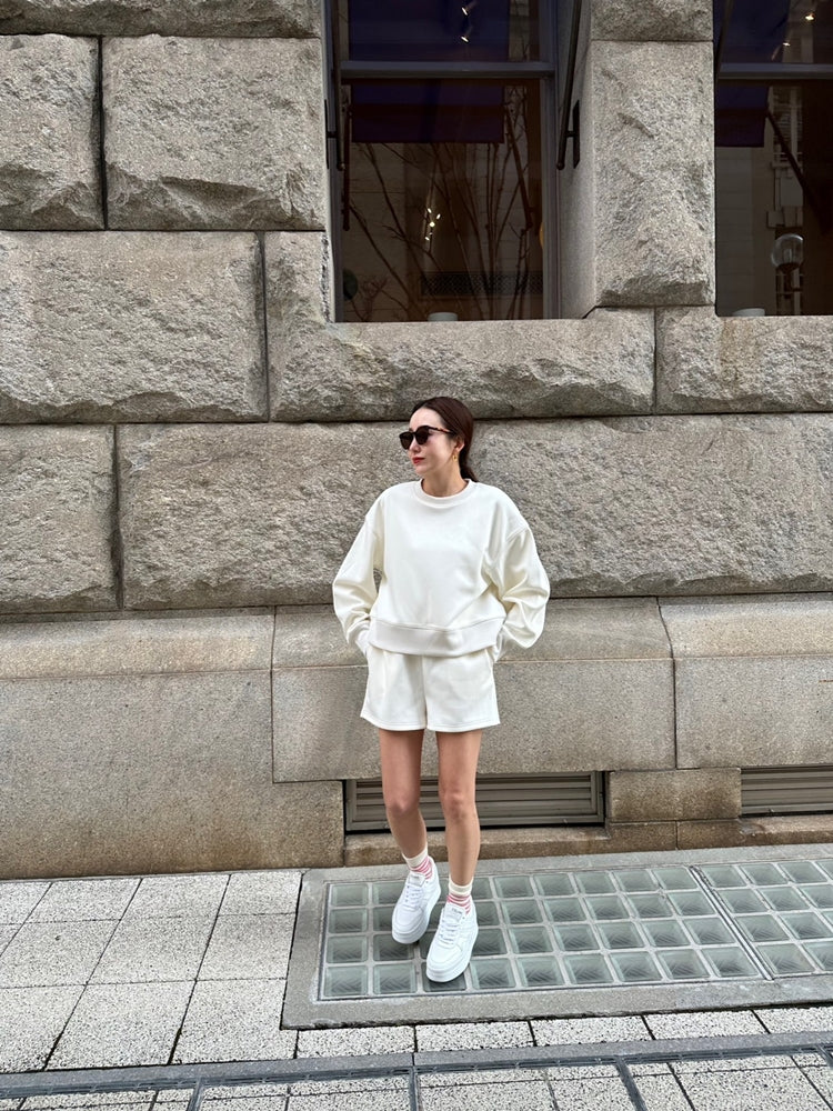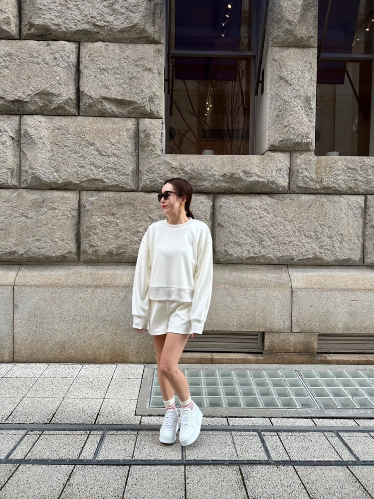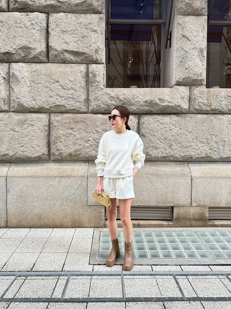 長袖トップスとのバランスを考え、抜け感と脚長効果が生まれるようショートパンツの丈感はあえて少し短めにしています。