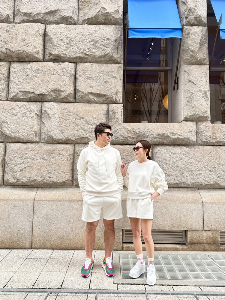 同時に販売するメンズと同じ素材、同じセットアップでもショートパンツの丈感や、フードありなしにする事により完全なペアルックにならず、ご夫婦やカップルで一緒に着ていただいてもおしゃれに仕上がります。