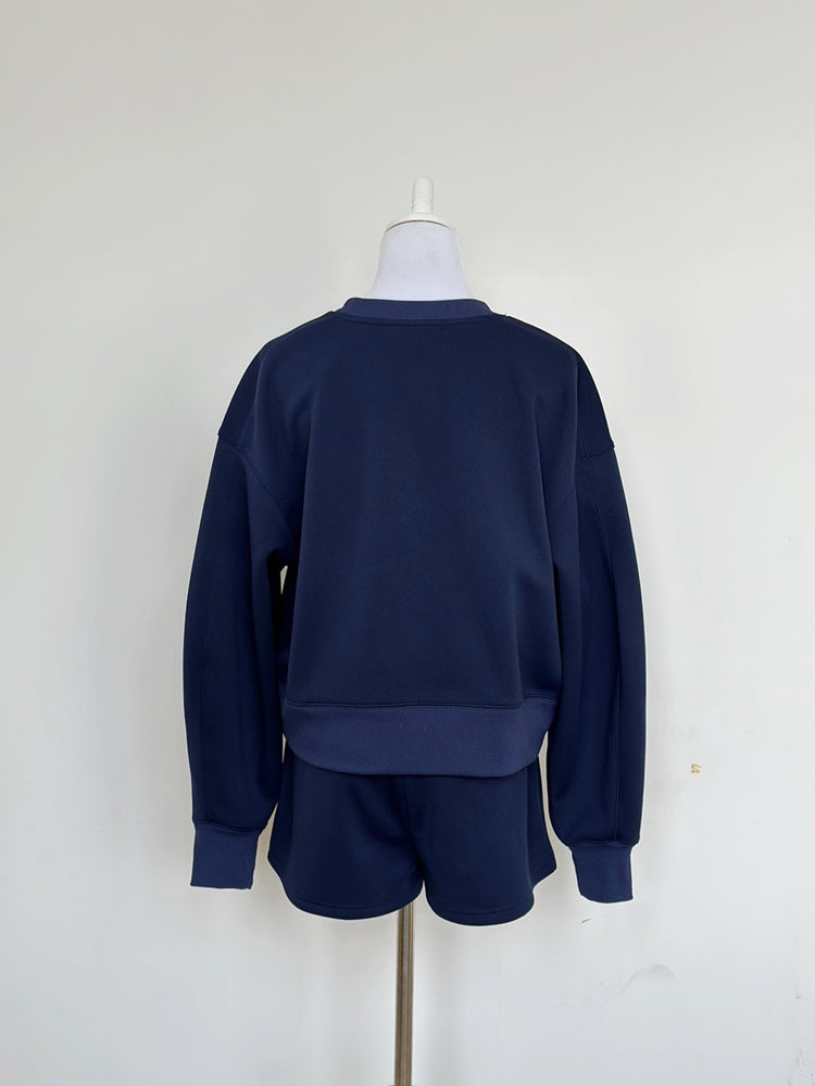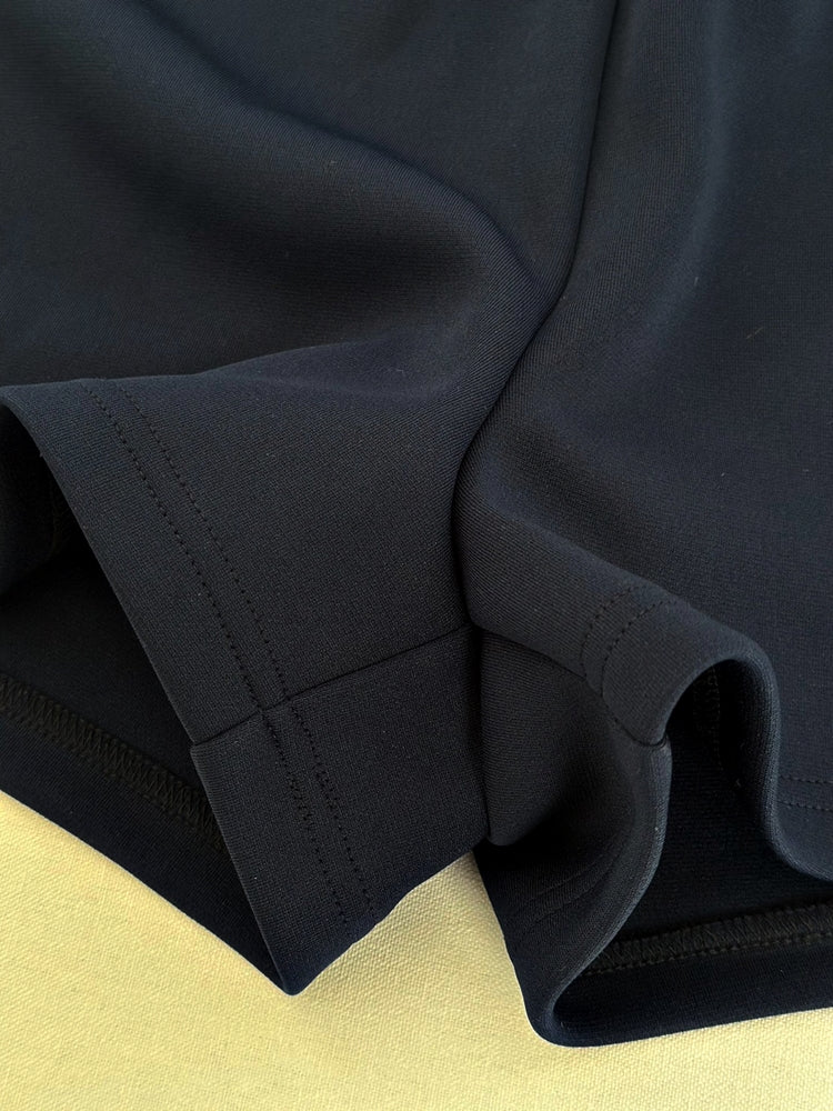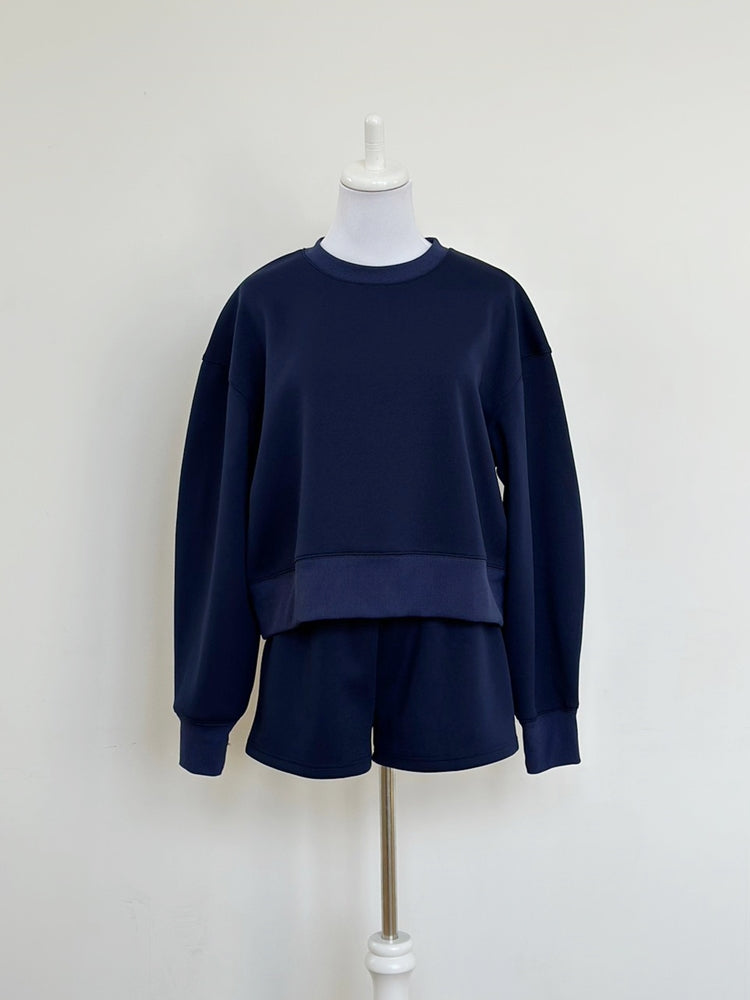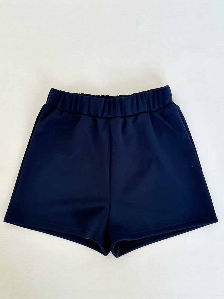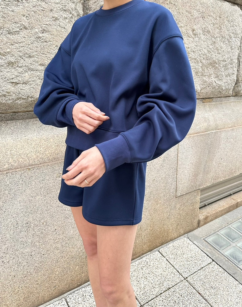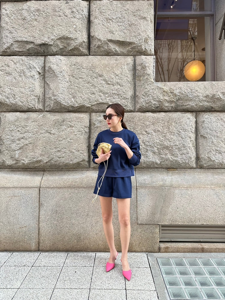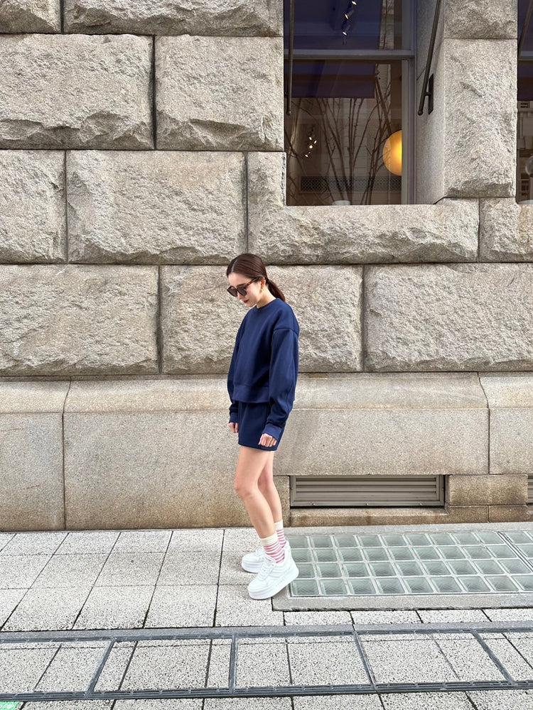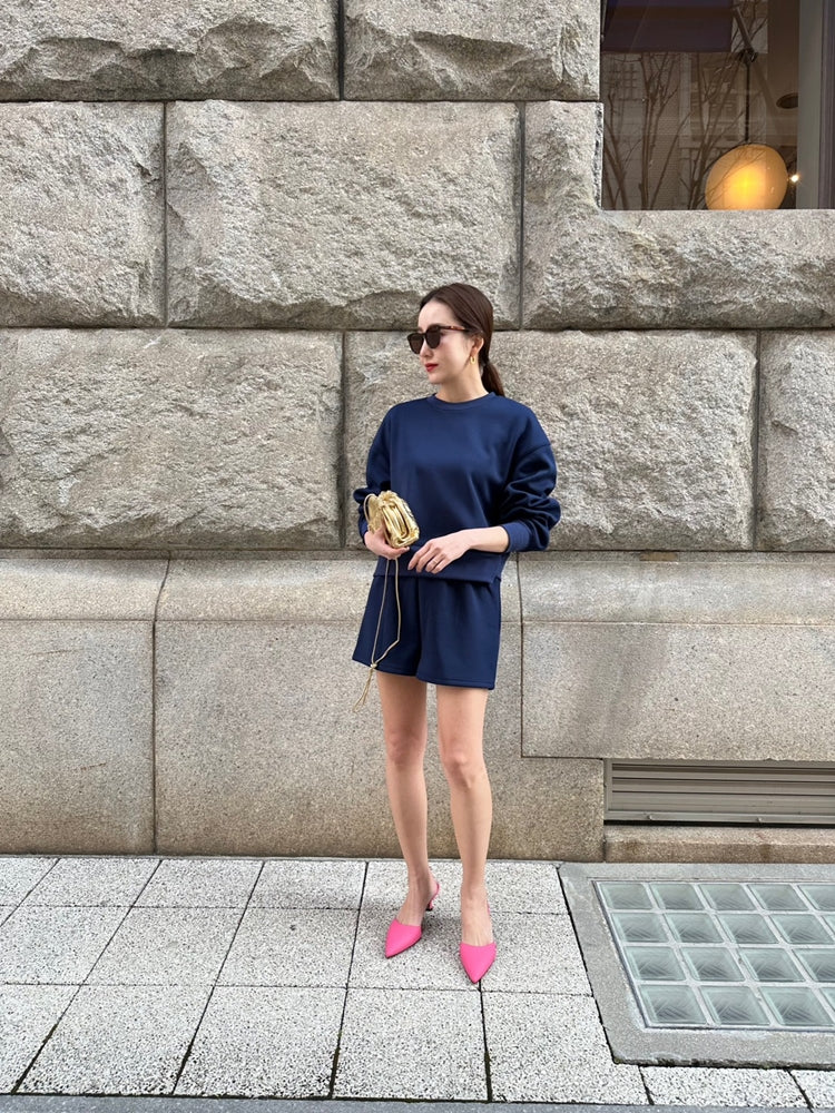 長袖トップスとのバランスを考え、抜け感と脚長効果が生まれるようショートパンツの丈感はあえて少し短めにしています。