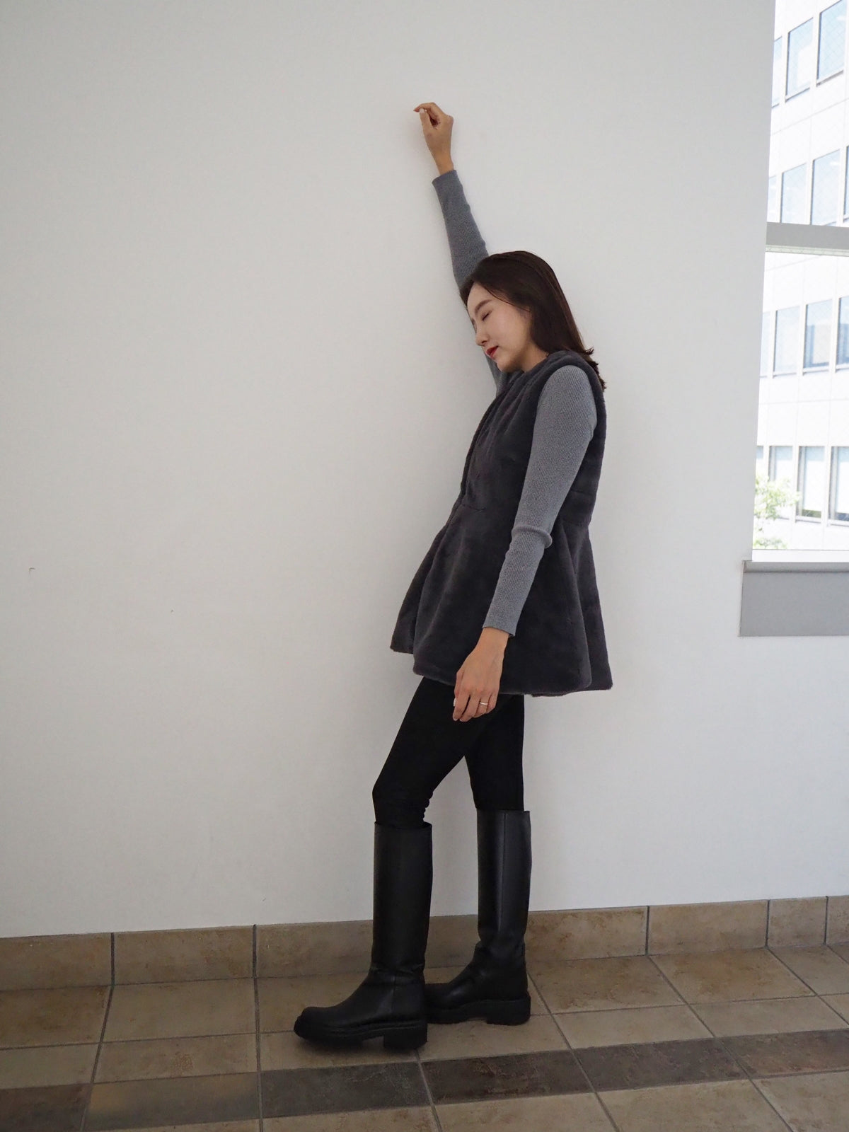 長すぎず短すぎない丈感ですのでスタイルアップが叶い、程良い厚みに仕上げていますので冬にはコートの下にも着ていただけます。